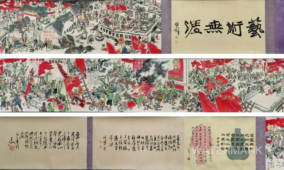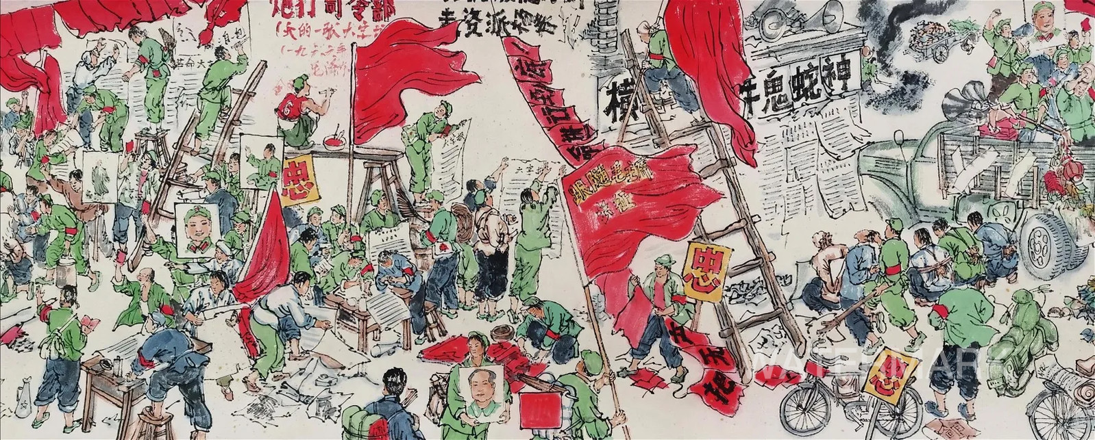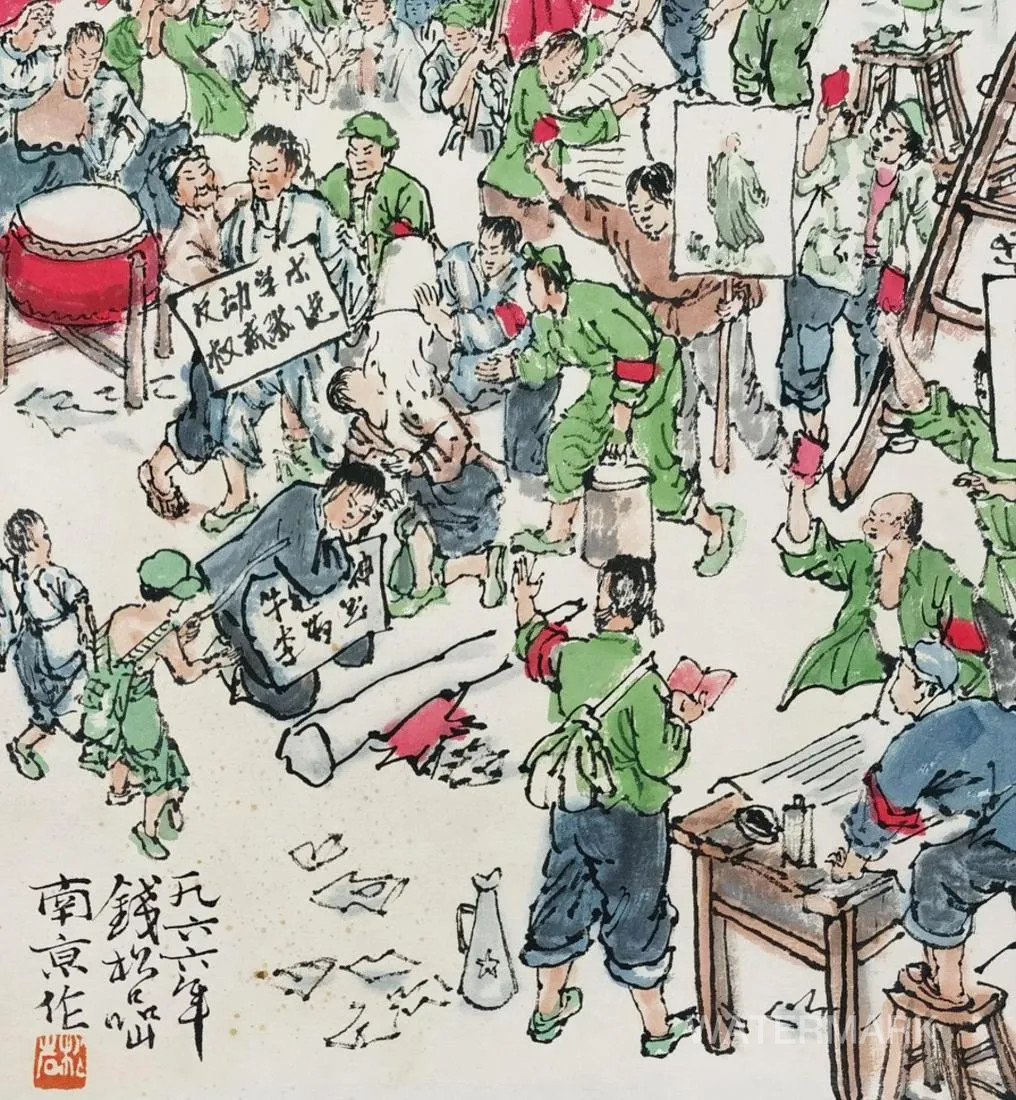 点评:一幅不可多得的文革写真图!是赞颂?还是贬抑?大概在一九六六年文革初期,作为一代老艺术家, 也只能被“革命”洪流裹挟,如实记录了当年的疯狂与暴虐,成就了一幅历史书画。