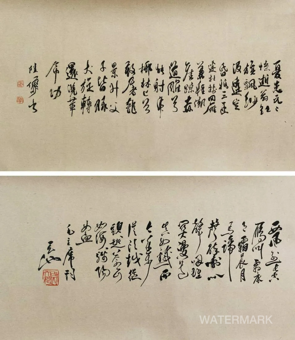 程十发的题首,典型的篆隶行草,独特的“破体书”,凝重奇倔; 陆俨少题跋更显其独树一帜的“陆体”书风。所有题跋更印证了本幅画作乃钱松岩少有的人物真品和历史题材画!